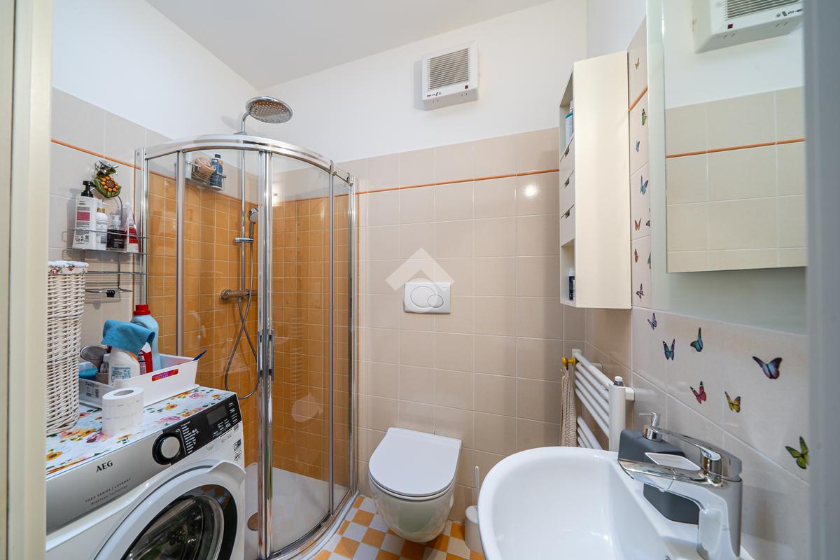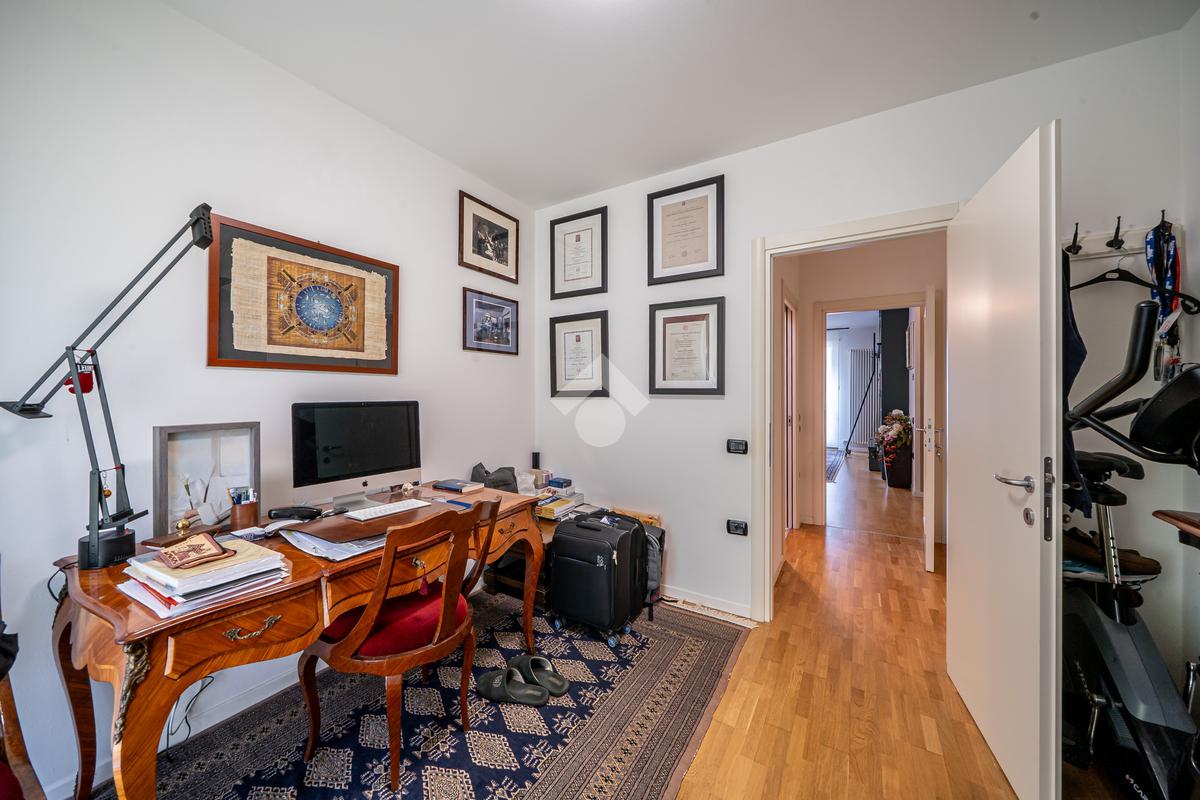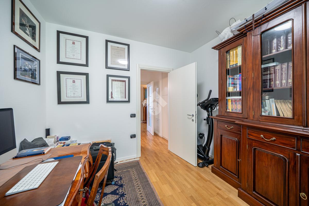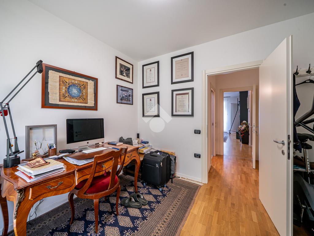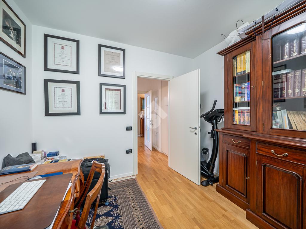 Un disimpegno conduce a una stanza, attualmente adibita a studio e a un bagno di servizio, completo di box doccia e spazioso abbastanza da poter ospitare anche elettrodomestici come lavatrice e/o asciugatrice.
