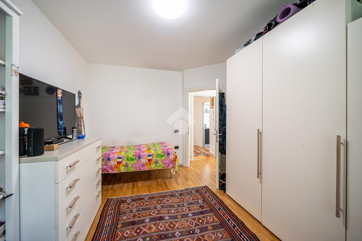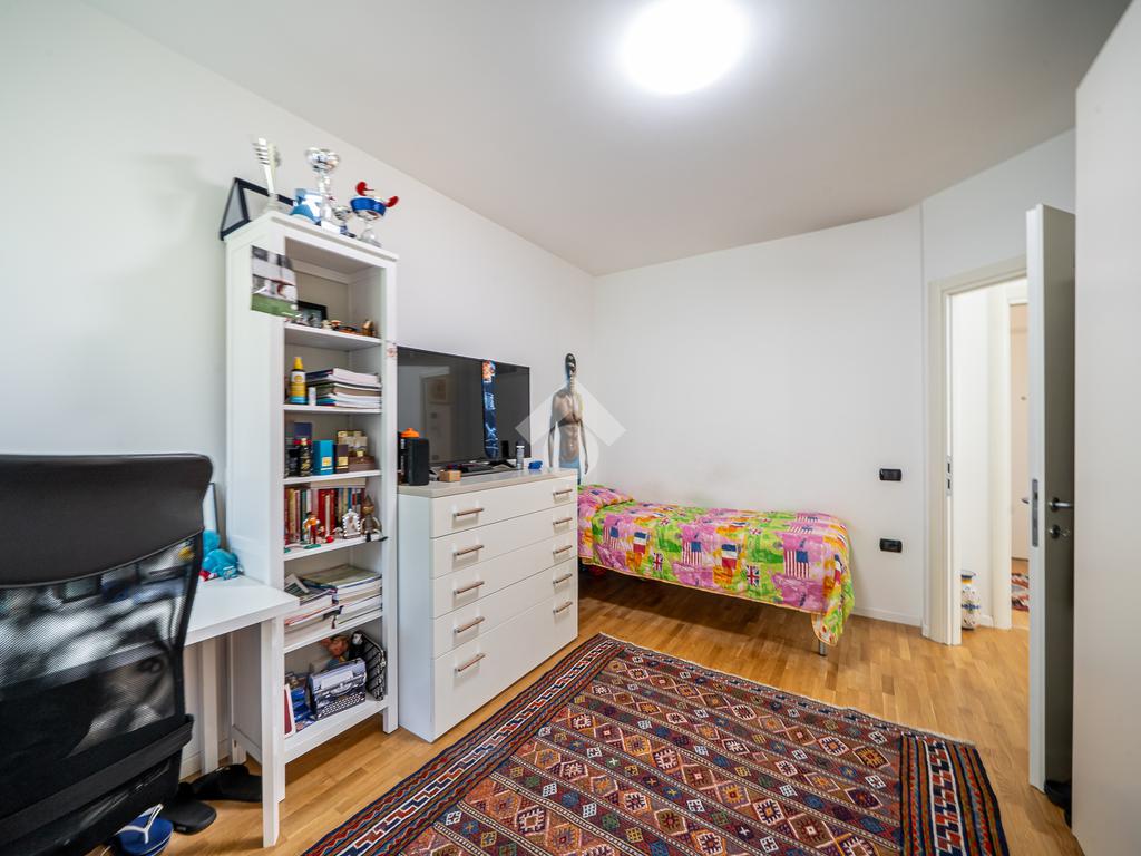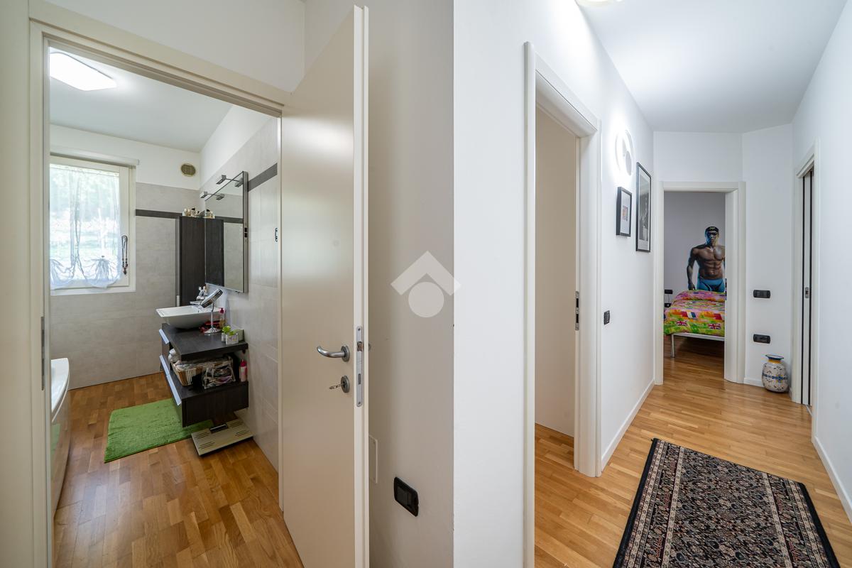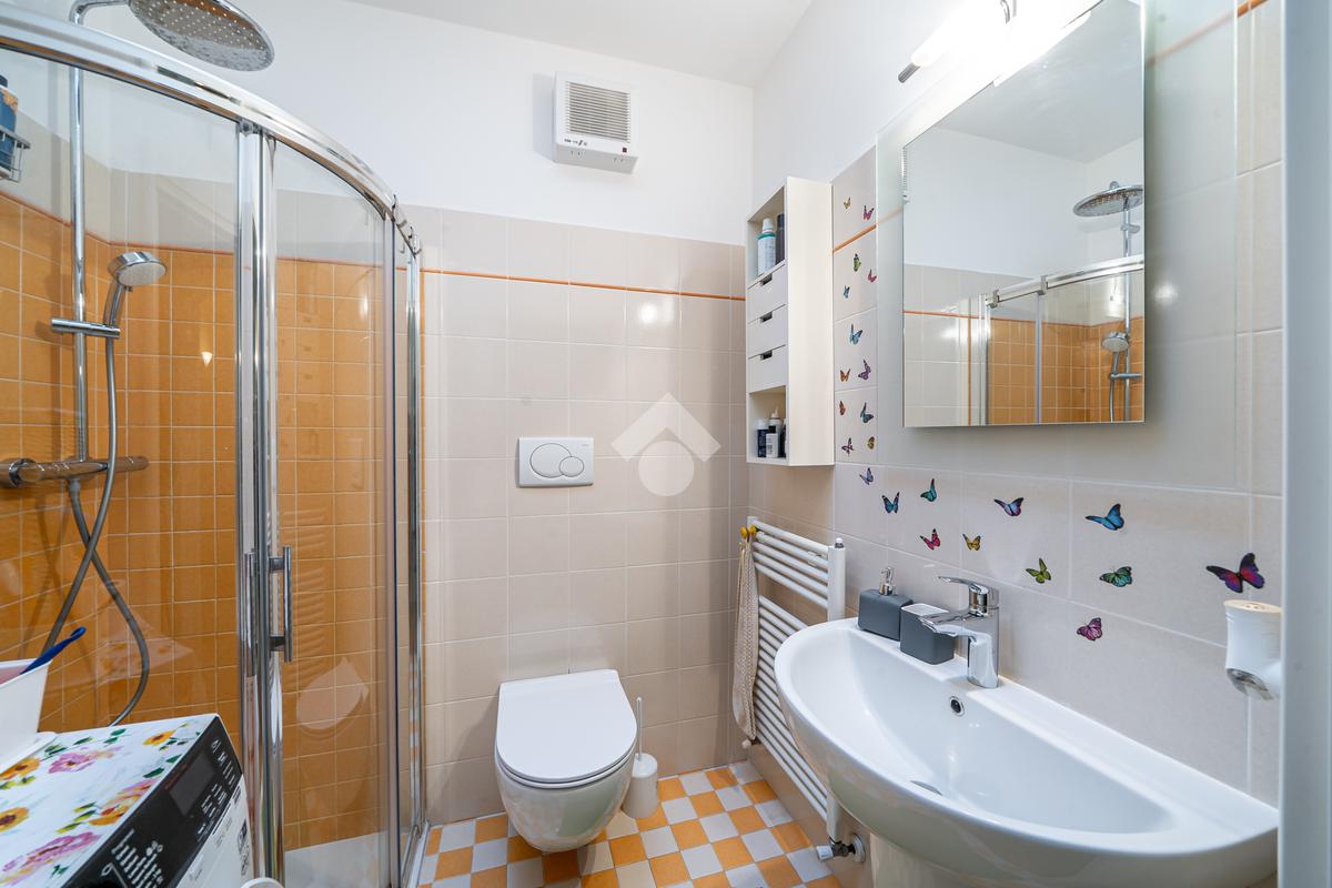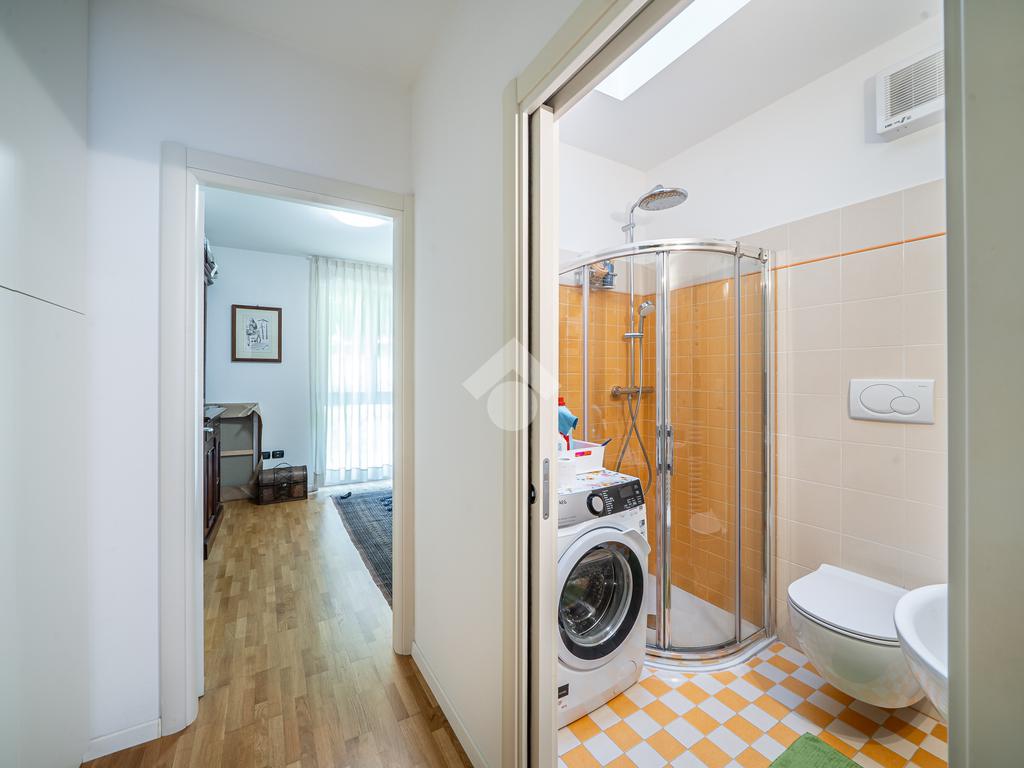 Un disimpegno conduce a una stanza, attualmente adibita a studio e a un bagno di servizio, completo di box doccia e spazioso abbastanza da poter ospitare anche elettrodomestici come lavatrice e/o asciugatrice.